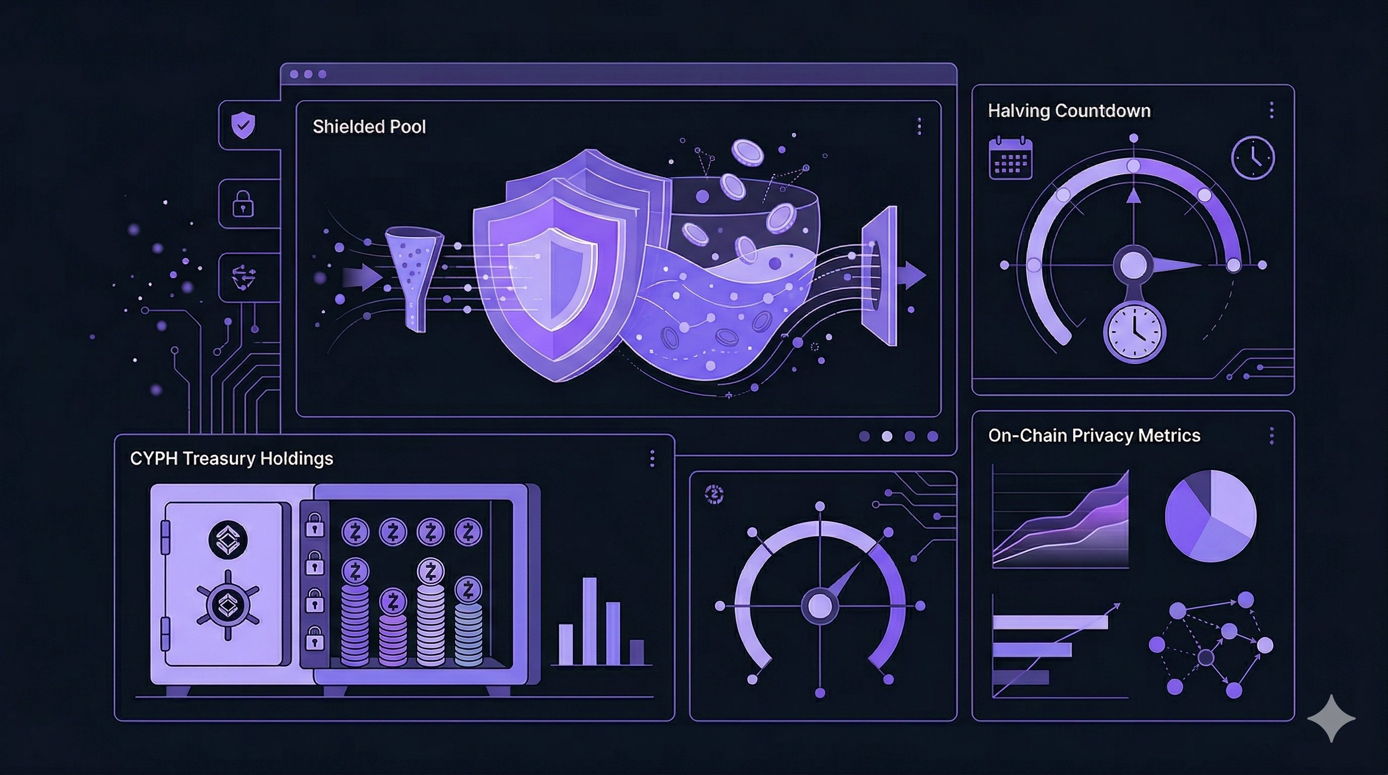 Live trackers for shielded pool size, CYPH treasury holdings, halving countdown, and on-chain privacy metrics.